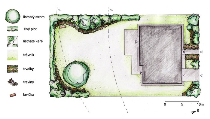 Trávník bude založen ve stávajícím terénu bez doplnění ornice a speciálních substrátů, použita bude parková směs, případně směs do polostínu. Každopádně by měl být proveden postřik pozemku totálním herbicidem proti plevelům, protože vynechání této důležité operace může znamenat, že budete nejméně jeden rok zápolit s plevely, které vzejdou současně s trávníkem a také strávíte mnohem více času při pletí. Ovšem i to se dá zvládnout. Vlastní výsadby a živé ploty budou provedeny z listnatých a jehličnatých keřů v základních velikostech (20/30), které budou doplněny trvalkami a okrasnými travami, použité stromy velikosti 8-10 až 10-12 s balem. Všechny výsadby budou samozřejmě mulčovány kůrou v tl. od 5 do 10 cm (kůra může být nahrazena dřevní štěpkou, která je levnější).